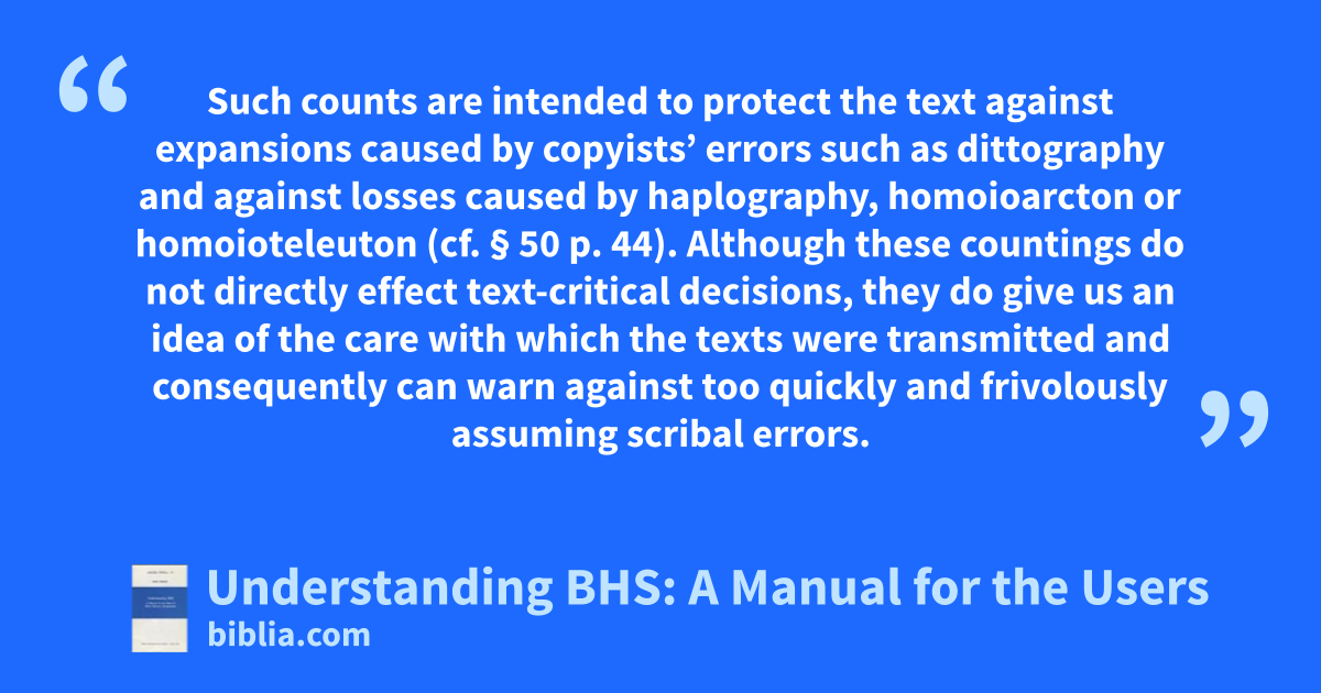 Such counts are intended to protect the text against expansions caused by copyists’ errors such as dittography and against losses caused by haplography, homoioarcton or homoioteleuton (cf. § 50 p. 44). Although these countings do not directly effect text-critical decisions, they do give us an idea of the care with which the texts were transmitted and consequently can warn against too quickly and frivolously assuming scribal errors.
