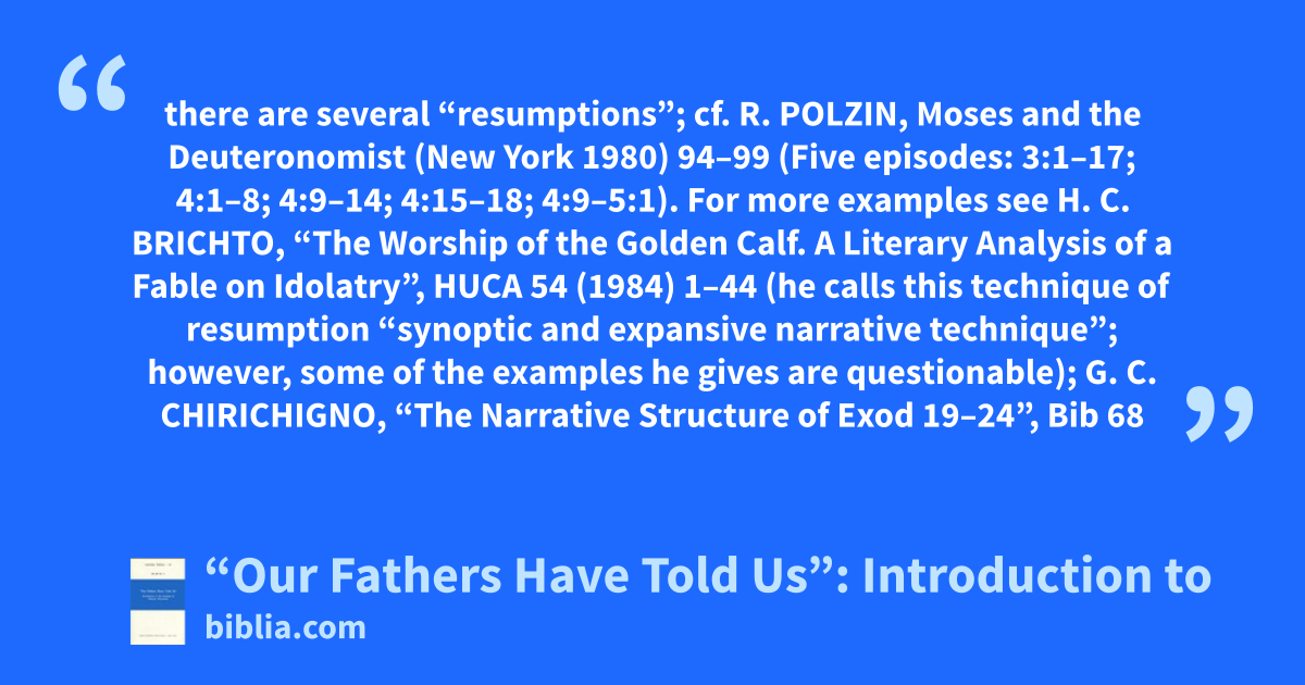 there are several “resumptions”; cf. R. POLZIN, Moses and the Deuteronomist (New York 1980) 94–99 (Five episodes: 3:1–17; 4:1–8; 4:9–14; 4:15–18; 4:9–5:1). For more examples see H. C. BRICHTO, “The Worship of the Golden Calf. A Literary Analysis of a Fable on Idolatry”, HUCA 54 (1984) 1–44 (he calls this technique of resumption “synoptic and expansive narrative technique”; however, some of the examples he gives are questionable); G. C. CHIRICHIGNO, “The Narrative Structure of Exod 19–24”, Bib 68