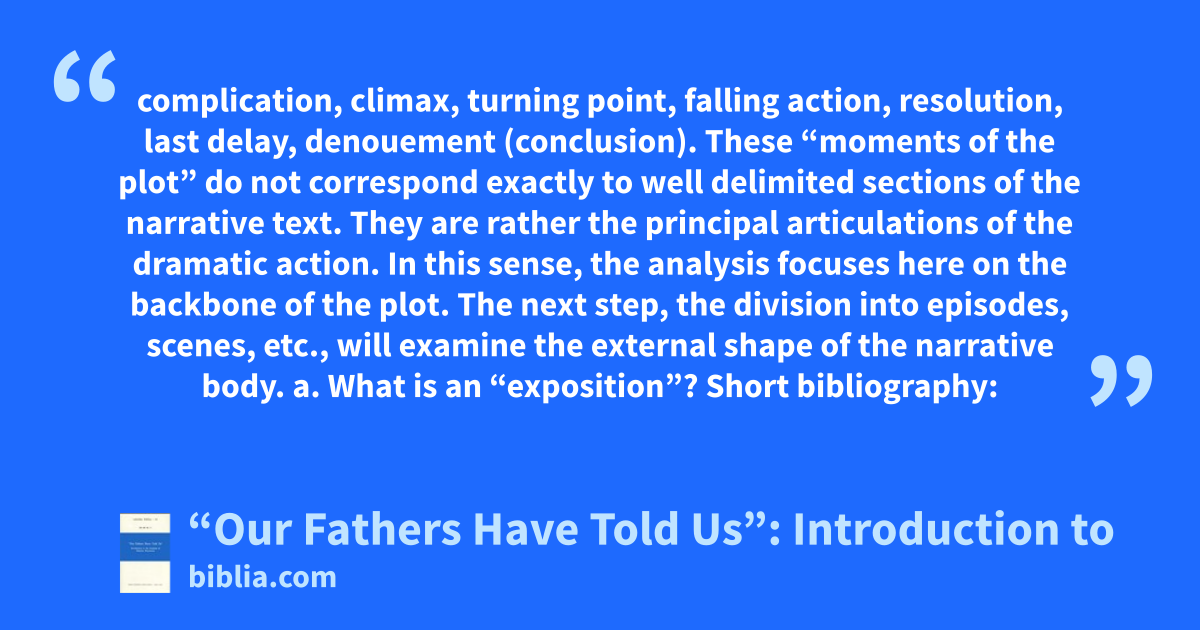 complication, climax, turning point, falling action, resolution, last delay, denouement (conclusion). These “moments of the plot” do not correspond exactly to well delimited sections of the narrative text. They are rather the principal articulations of the dramatic action. In this sense, the analysis focuses here on the backbone of the plot. The next step, the division into episodes, scenes, etc., will examine the external shape of the narrative body. a. What is an “exposition”? Short bibliography: