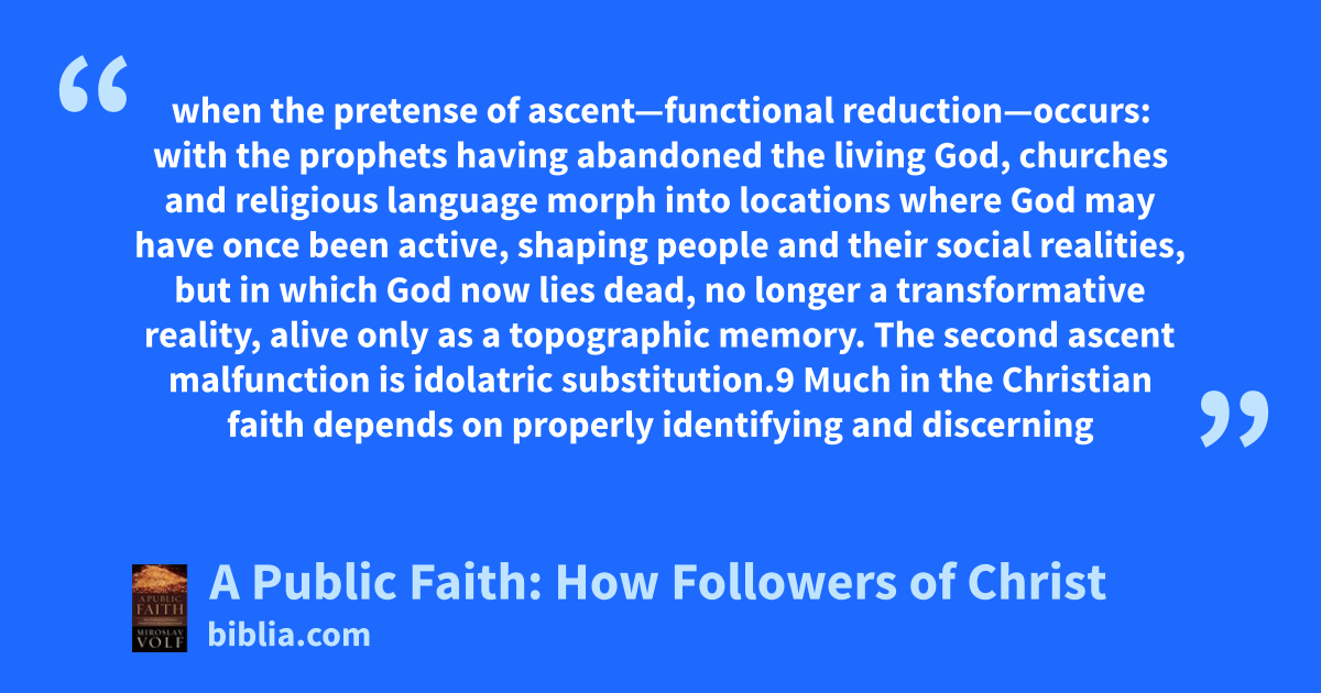 when the pretense of ascent—functional reduction—occurs: with the prophets having abandoned the living God, churches and religious language morph into locations where God may have once been active, shaping people and their social realities, but in which God now lies dead, no longer a transformative reality, alive only as a topographic memory. The second ascent malfunction is idolatric substitution.9 Much in the Christian faith depends on properly identifying and discerning
