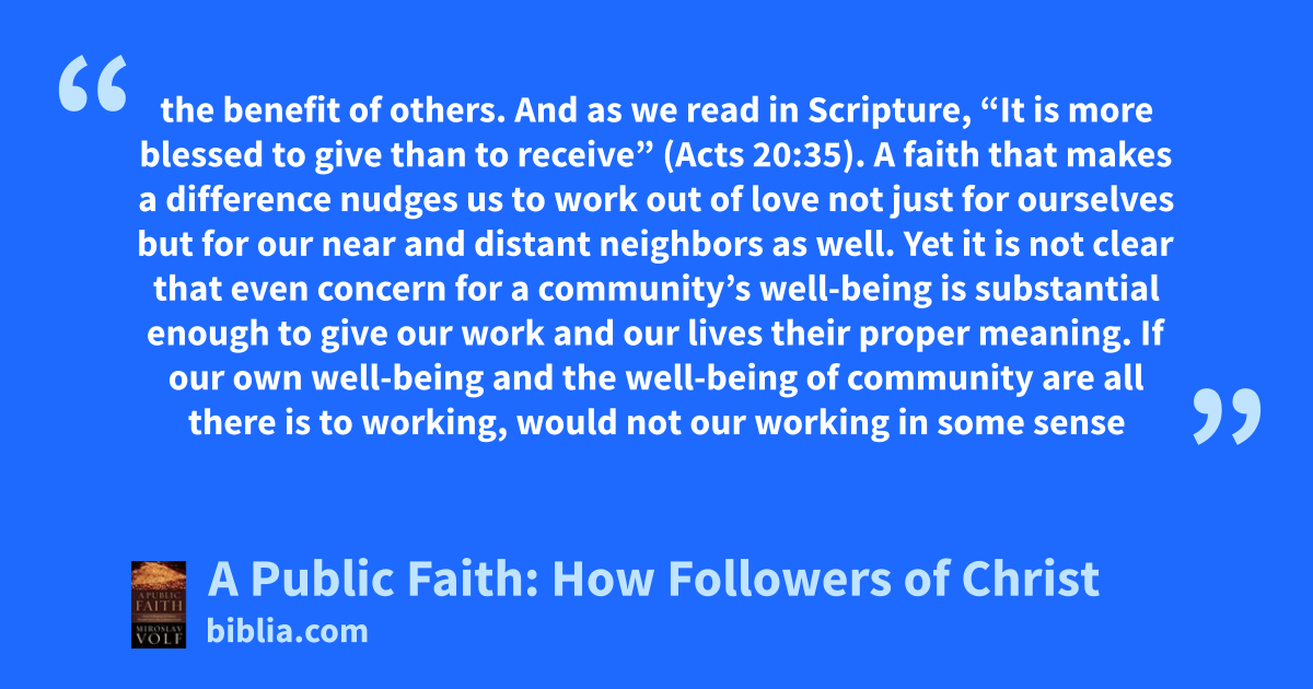 the benefit of others. And as we read in Scripture, “It is more blessed to give than to receive” (Acts 20:35). A faith that makes a difference nudges us to work out of love not just for ourselves but for our near and distant neighbors as well. Yet it is not clear that even concern for a community’s well-being is substantial enough to give our work and our lives their proper meaning. If our own well-being and the well-being of community are all there is to working, would not our working in some sense