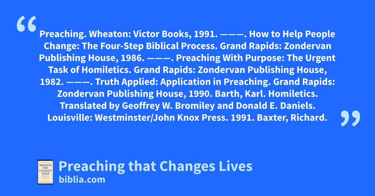 Preaching. Wheaton: Victor Books, 1991. ———. How to Help People Change: The Four-Step Biblical Process. Grand Rapids: Zondervan Publishing House, 1986. ———. Preaching With Purpose: The Urgent Task of Homiletics. Grand Rapids: Zondervan Publishing House, 1982. ———. Truth Applied: Application in Preaching. Grand Rapids: Zondervan Publishing House, 1990. Barth, Karl. Homiletics. Translated by Geoffrey W. Bromiley and Donald E. Daniels. Louisville: Westminster/John Knox Press. 1991. Baxter, Richard.