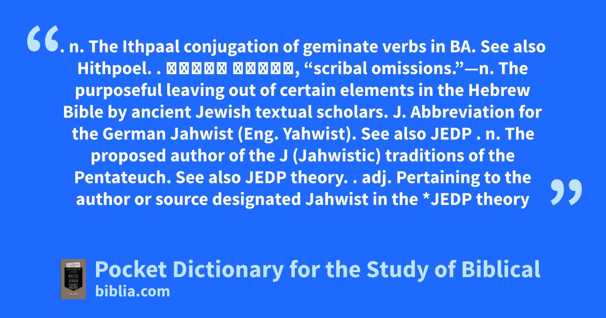 . n. The Ithpaal conjugation of geminate verbs in BA. See also Hithpoel. . עטורי ספרים, “scribal omissions.”—n. The purposeful leaving out of certain elements in the Hebrew Bible by ancient Jewish textual scholars. J. Abbreviation for the German Jahwist (Eng. Yahwist). See also JEDP . n. The proposed author of the J (Jahwistic) traditions of the Pentateuch. See also JEDP theory. . adj. Pertaining to the author or source designated Jahwist in the *JEDP theory