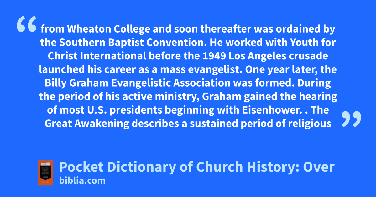 from Wheaton College and soon thereafter was ordained by the Southern Baptist Convention. He worked with Youth for Christ International before the 1949 Los Angeles crusade launched his career as a mass evangelist. One year later, the Billy Graham Evangelistic Association was formed. During the period of his active ministry, Graham gained the hearing of most U.S. presidents beginning with Eisenhower. . The Great Awakening describes a sustained period of religious