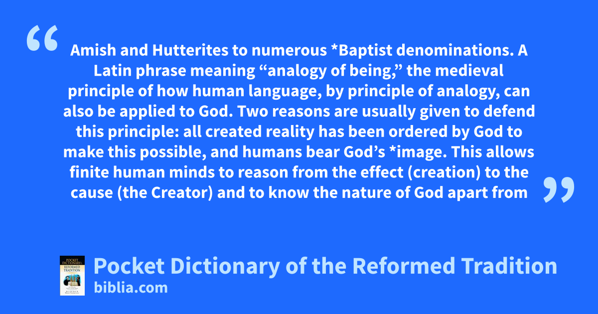Amish and Hutterites to numerous *Baptist denominations. A Latin phrase meaning “analogy of being,” the medieval principle of how human language, by principle of analogy, can also be applied to God. Two reasons are usually given to defend this principle: all created reality has been ordered by God to make this possible, and humans bear God’s *image. This allows finite human minds to reason from the effect (creation) to the cause (the Creator) and to know the nature of God apart from