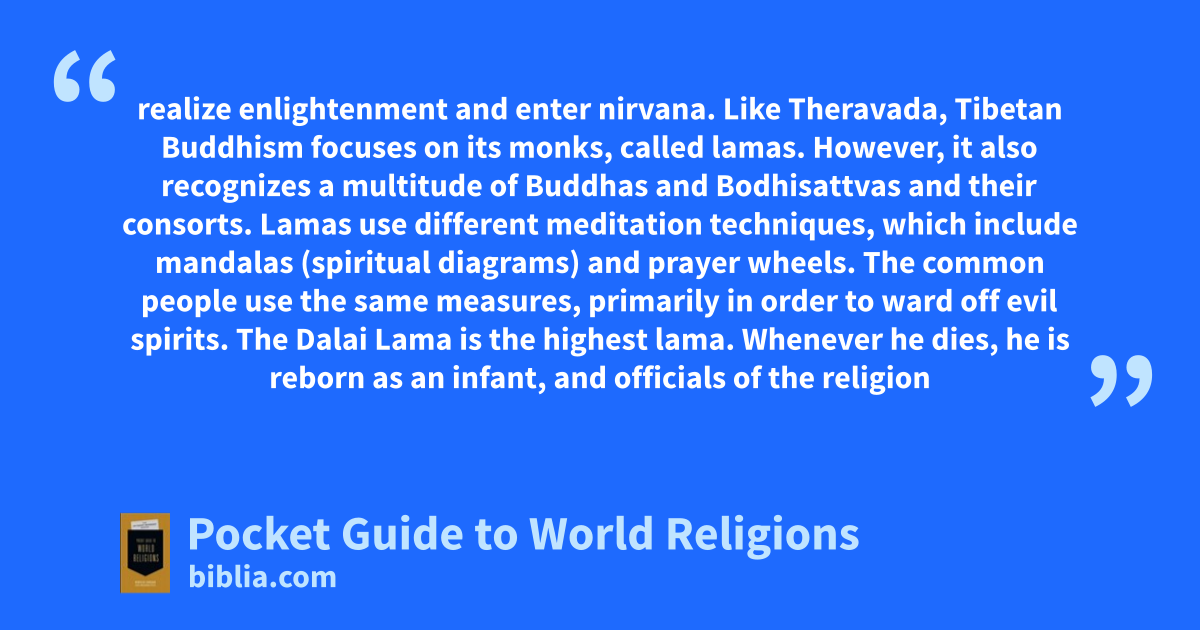 realize enlightenment and enter nirvana. Like Theravada, Tibetan Buddhism focuses on its monks, called lamas. However, it also recognizes a multitude of Buddhas and Bodhisattvas and their consorts. Lamas use different meditation techniques, which include mandalas (spiritual diagrams) and prayer wheels. The common people use the same measures, primarily in order to ward off evil spirits. The Dalai Lama is the highest lama. Whenever he dies, he is reborn as an infant, and officials of the religion