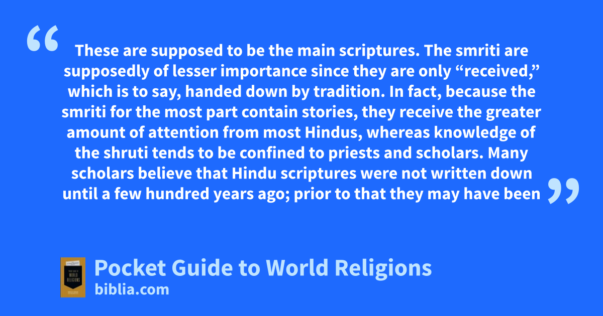 These are supposed to be the main scriptures. The smriti are supposedly of lesser importance since they are only “received,” which is to say, handed down by tradition. In fact, because the smriti for the most part contain stories, they receive the greater amount of attention from most Hindus, whereas knowledge of the shruti tends to be confined to priests and scholars. Many scholars believe that Hindu scriptures were not written down until a few hundred years ago; prior to that they may have been