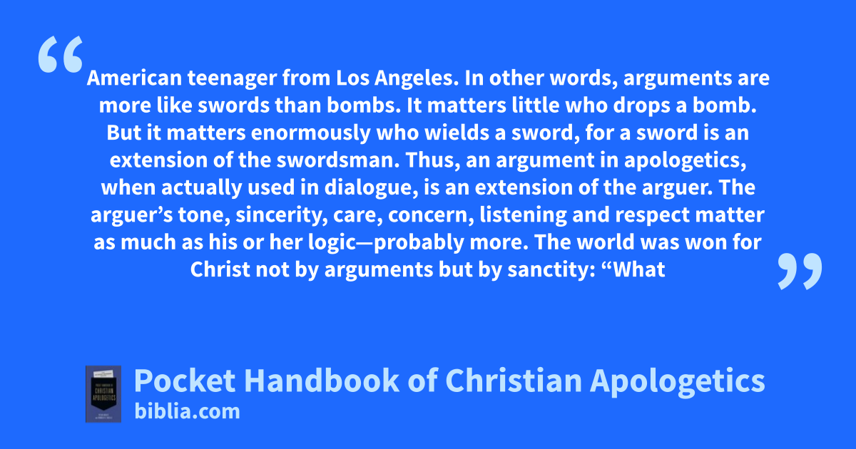 American teenager from Los Angeles. In other words, arguments are more like swords than bombs. It matters little who drops a bomb. But it matters enormously who wields a sword, for a sword is an extension of the swordsman. Thus, an argument in apologetics, when actually used in dialogue, is an extension of the arguer. The arguer’s tone, sincerity, care, concern, listening and respect matter as much as his or her logic—probably more. The world was won for Christ not by arguments but by sanctity: “What