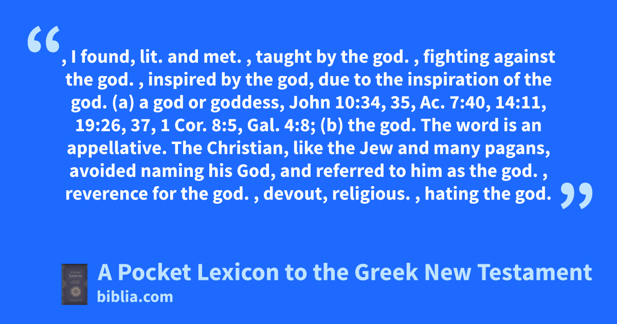 , I found, lit. and met. , taught by the god. , fighting against the god. , inspired by the god, due to the inspiration of the god. (a) a god or goddess, John 10:34, 35, Ac. 7:40, 14:11, 19:26, 37, 1 Cor. 8:5, Gal. 4:8; (b) the god. The word is an appellative. The Christian, like the Jew and many pagans, avoided naming his God, and referred to him as the god. , reverence for the god. , devout, religious. , hating the god.