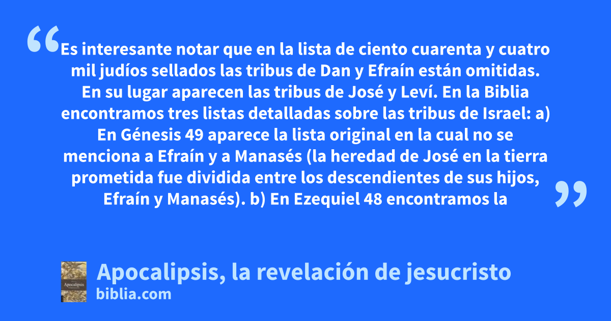 Es interesante notar que en la lista de ciento cuarenta y cuatro mil judíos sellados las tribus de Dan y Efraín están omitidas. En su lugar aparecen las tribus de José y Leví. En la Biblia encontramos tres listas detalladas sobre las tribus de Israel: a) En Génesis 49 aparece la lista original en la cual no se menciona a Efraín y a Manasés (la heredad de José en la tierra prometida fue dividida entre los descendientes de sus hijos, Efraín y Manasés). b) En Ezequiel 48 encontramos la