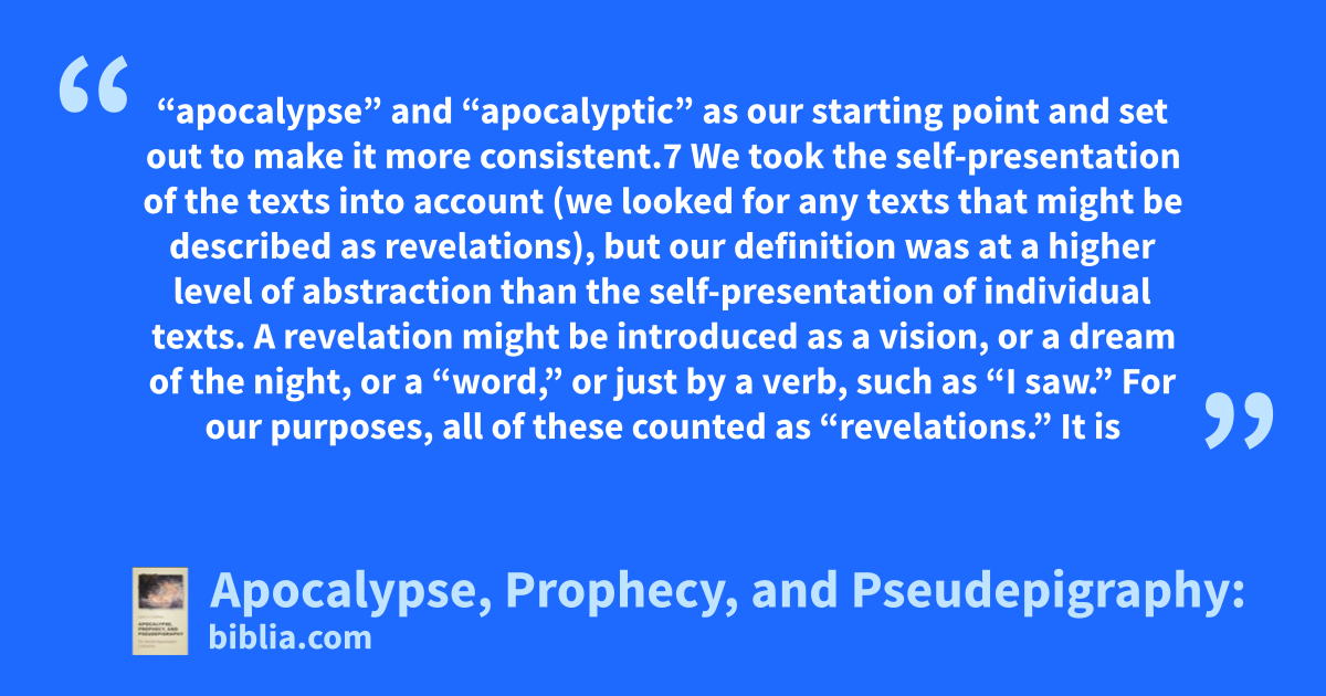“apocalypse” and “apocalyptic” as our starting point and set out to make it more consistent.7 We took the self-presentation of the texts into account (we looked for any texts that might be described as revelations), but our definition was at a higher level of abstraction than the self-presentation of individual texts. A revelation might be introduced as a vision, or a dream of the night, or a “word,” or just by a verb, such as “I saw.” For our purposes, all of these counted as “revelations.” It is