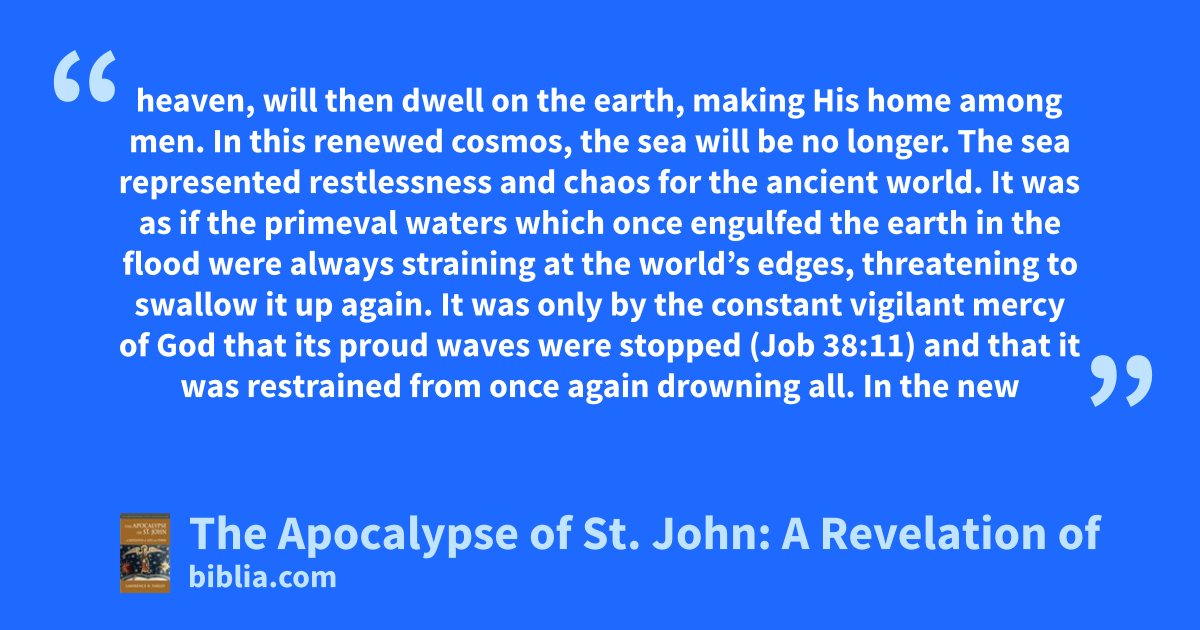 heaven, will then dwell on the earth, making His home among men. In this renewed cosmos, the sea will be no longer. The sea represented restlessness and chaos for the ancient world. It was as if the primeval waters which once engulfed the earth in the flood were always straining at the world’s edges, threatening to swallow it up again. It was only by the constant vigilant mercy of God that its proud waves were stopped (Job 38:11) and that it was restrained from once again drowning all. In the new