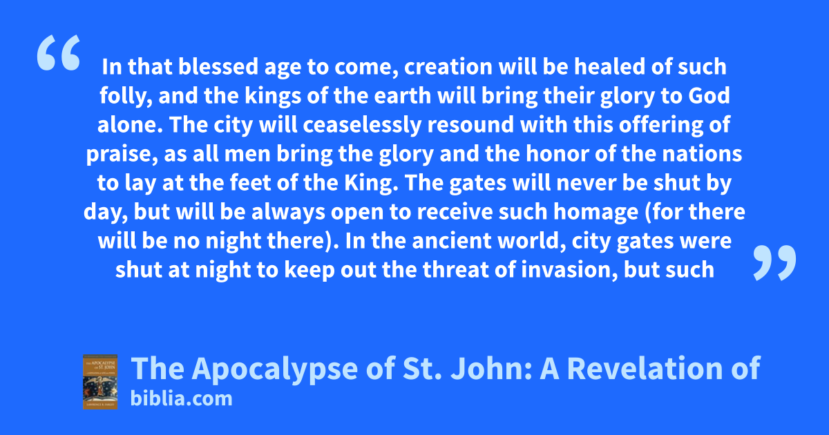 In that blessed age to come, creation will be healed of such folly, and the kings of the earth will bring their glory to God alone. The city will ceaselessly resound with this offering of praise, as all men bring the glory and the honor of the nations to lay at the feet of the King. The gates will never be shut by day, but will be always open to receive such homage (for there will be no night there). In the ancient world, city gates were shut at night to keep out the threat of invasion, but such