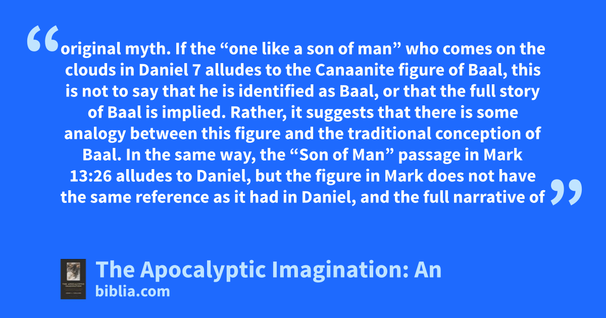 original myth. If the “one like a son of man” who comes on the clouds in Daniel 7 alludes to the Canaanite figure of Baal, this is not to say that he is identified as Baal, or that the full story of Baal is implied. Rather, it suggests that there is some analogy between this figure and the traditional conception of Baal. In the same way, the “Son of Man” passage in Mark 13:26 alludes to Daniel, but the figure in Mark does not have the same reference as it had in Daniel, and the full narrative of
