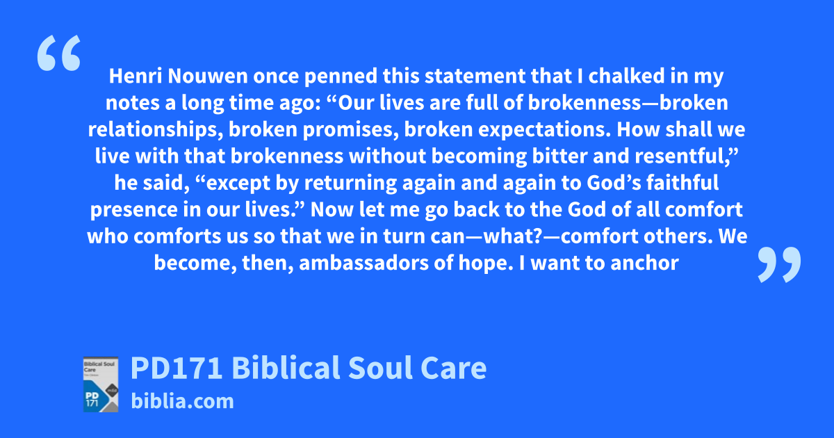Henri Nouwen once penned this statement that I chalked in my notes a long time ago: “Our lives are full of brokenness—broken relationships, broken promises, broken expectations. How shall we live with that brokenness without becoming bitter and resentful,” he said, “except by returning again and again to God’s faithful presence in our lives.” Now let me go back to the God of all comfort who comforts us so that we in turn can—what?—comfort others. We become, then, ambassadors of hope. I want to anchor