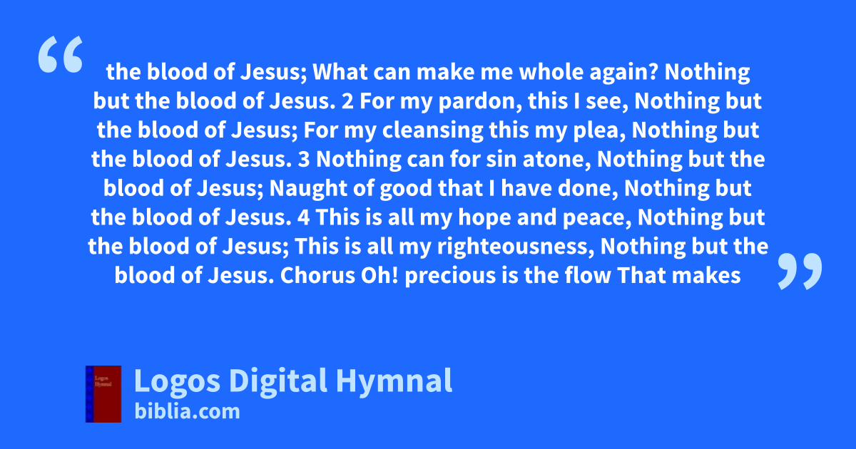 the blood of Jesus; What can make me whole again? Nothing but the blood of Jesus. 2 For my pardon, this I see, Nothing but the blood of Jesus; For my cleansing this my plea, Nothing but the blood of Jesus. 3 Nothing can for sin atone, Nothing but the blood of Jesus; Naught of good that I have done, Nothing but the blood of Jesus. 4 This is all my hope and peace, Nothing but the blood of Jesus; This is all my righteousness, Nothing but the blood of Jesus. Chorus Oh! precious is the flow That makes