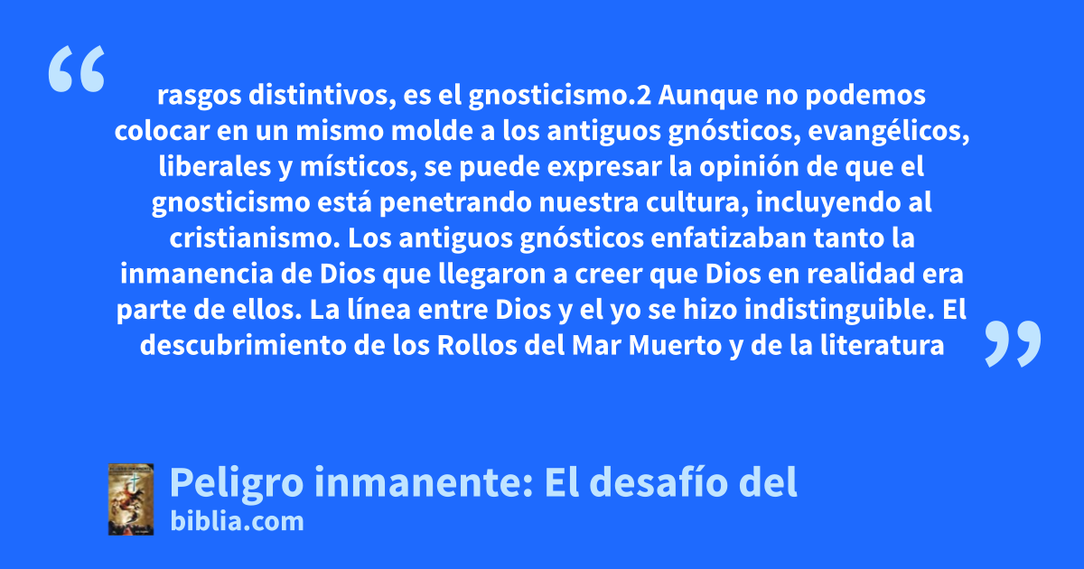 rasgos distintivos, es el gnosticismo.2 Aunque no podemos colocar en un mismo molde a los antiguos gnósticos, evangélicos, liberales y místicos, se puede expresar la opinión de que el gnosticismo está penetrando nuestra cultura, incluyendo al cristianismo. Los antiguos gnósticos enfatizaban tanto la inmanencia de Dios que llegaron a creer que Dios en realidad era parte de ellos. La línea entre Dios y el yo se hizo indistinguible. El descubrimiento de los Rollos del Mar Muerto y de la literatura