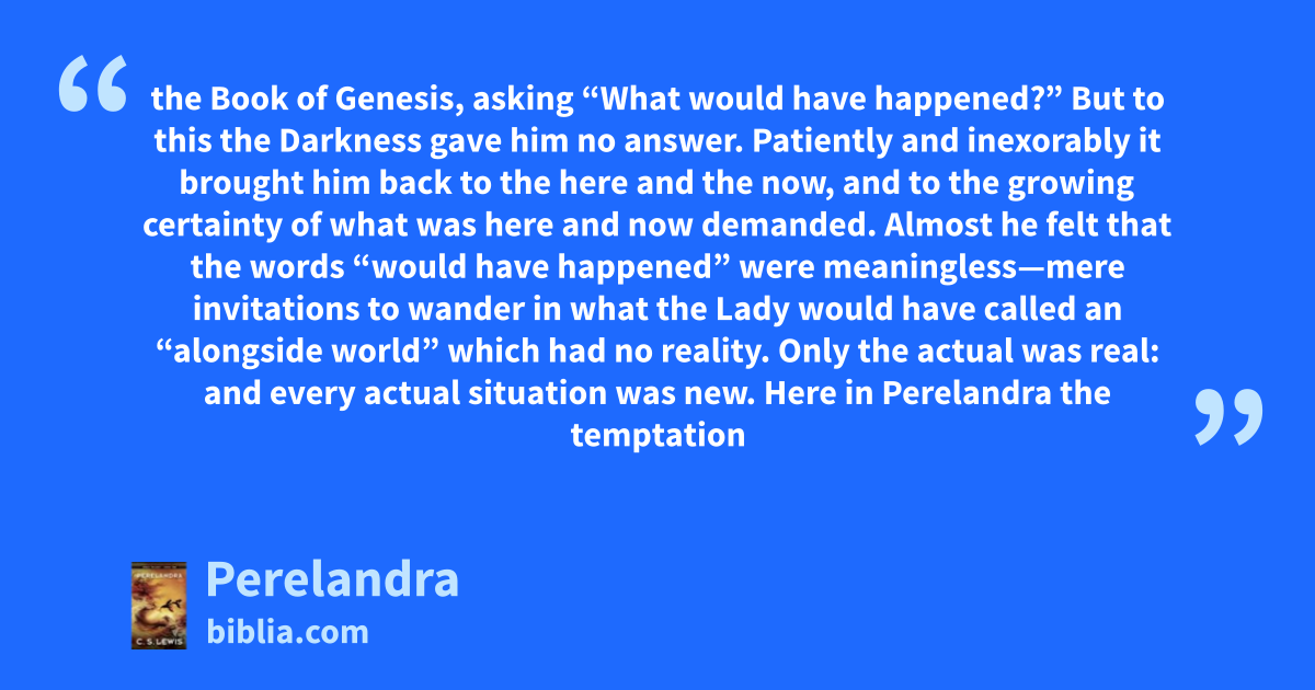the Book of Genesis, asking “What would have happened?” But to this the Darkness gave him no answer. Patiently and inexorably it brought him back to the here and the now, and to the growing certainty of what was here and now demanded. Almost he felt that the words “would have happened” were meaningless—mere invitations to wander in what the Lady would have called an “alongside world” which had no reality. Only the actual was real: and every actual situation was new. Here in Perelandra the temptation