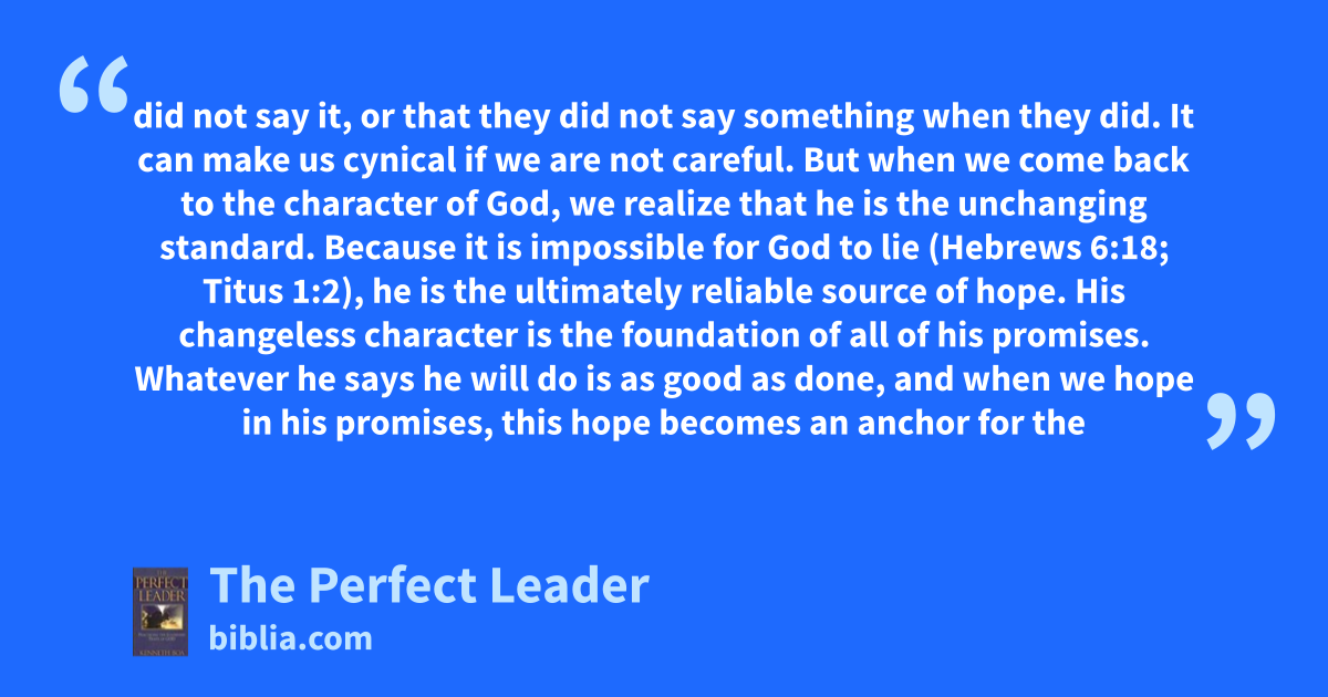 did not say it, or that they did not say something when they did. It can make us cynical if we are not careful. But when we come back to the character of God, we realize that he is the unchanging standard. Because it is impossible for God to lie (Hebrews 6:18; Titus 1:2), he is the ultimately reliable source of hope. His changeless character is the foundation of all of his promises. Whatever he says he will do is as good as done, and when we hope in his promises, this hope becomes an anchor for the