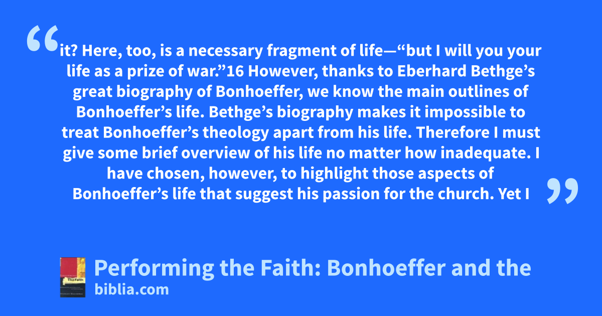 it? Here, too, is a necessary fragment of life—“but I will you your life as a prize of war.”16 However, thanks to Eberhard Bethge’s great biography of Bonhoeffer, we know the main outlines of Bonhoeffer’s life. Bethge’s biography makes it impossible to treat Bonhoeffer’s theology apart from his life. Therefore I must give some brief overview of his life no matter how inadequate. I have chosen, however, to highlight those aspects of Bonhoeffer’s life that suggest his passion for the church. Yet I