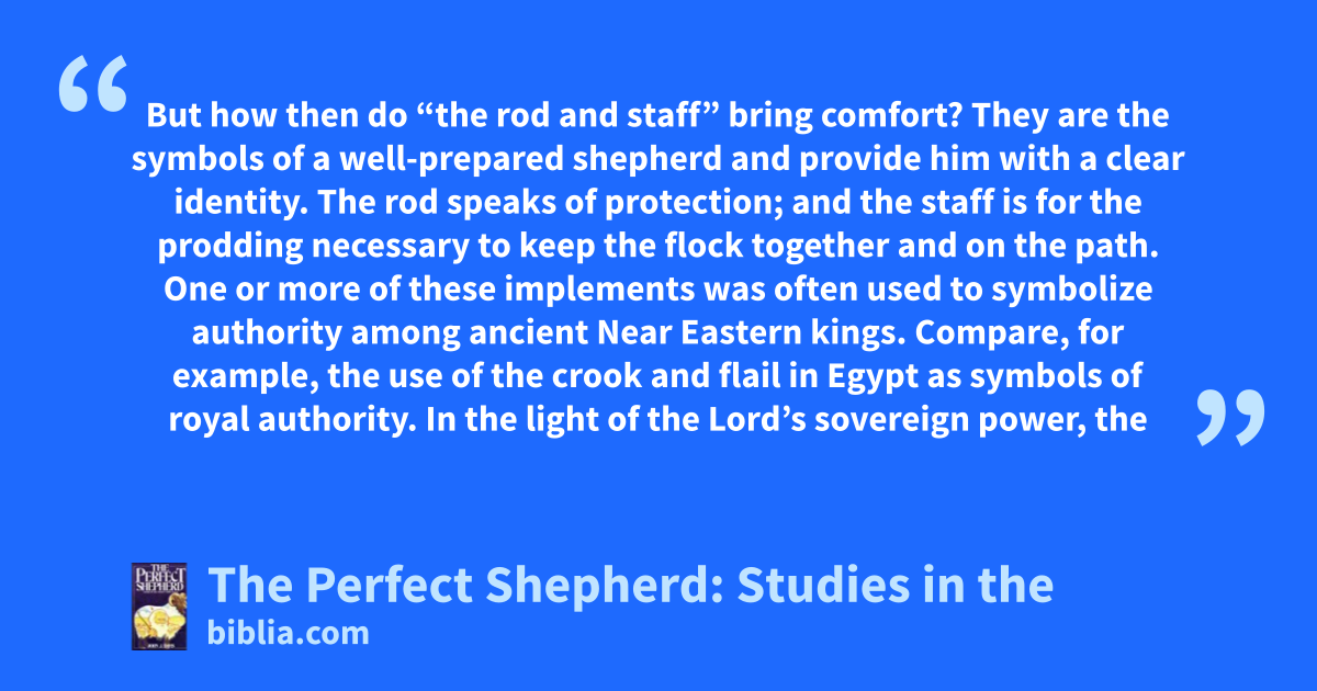 But how then do “the rod and staff” bring comfort? They are the symbols of a well-prepared shepherd and provide him with a clear identity. The rod speaks of protection; and the staff is for the prodding necessary to keep the flock together and on the path. One or more of these implements was often used to symbolize authority among ancient Near Eastern kings. Compare, for example, the use of the crook and flail in Egypt as symbols of royal authority. In the light of the Lord’s sovereign power, the