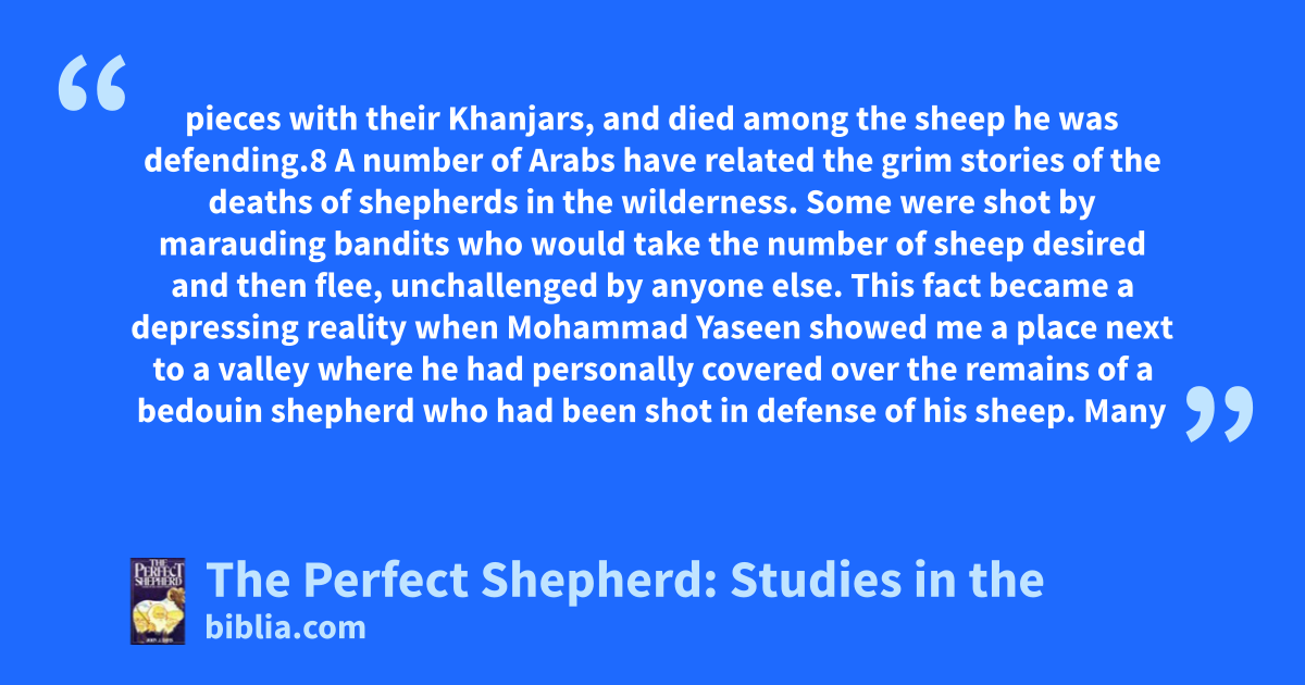 pieces with their Khanjars, and died among the sheep he was defending.8 A number of Arabs have related the grim stories of the deaths of shepherds in the wilderness. Some were shot by marauding bandits who would take the number of sheep desired and then flee, unchallenged by anyone else. This fact became a depressing reality when Mohammad Yaseen showed me a place next to a valley where he had personally covered over the remains of a bedouin shepherd who had been shot in defense of his sheep. Many