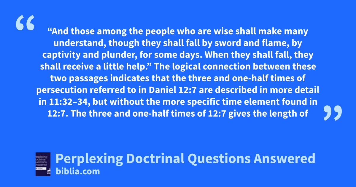 “And those among the people who are wise shall make many understand, though they shall fall by sword and flame, by captivity and plunder, for some days. When they shall fall, they shall receive a little help.” The logical connection between these two passages indicates that the three and one-half times of persecution referred to in Daniel 12:7 are described in more detail in 11:32–34, but without the more specific time element found in 12:7. The three and one-half times of 12:7 gives the length of