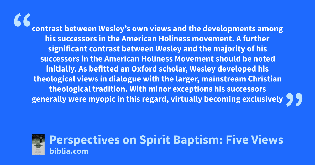 contrast between Wesley’s own views and the developments among his successors in the American Holiness movement. A further significant contrast between Wesley and the majority of his successors in the American Holiness Movement should be noted initially. As befitted an Oxford scholar, Wesley developed his theological views in dialogue with the larger, mainstream Christian theological tradition. With minor exceptions his successors generally were myopic in this regard, virtually becoming exclusively
