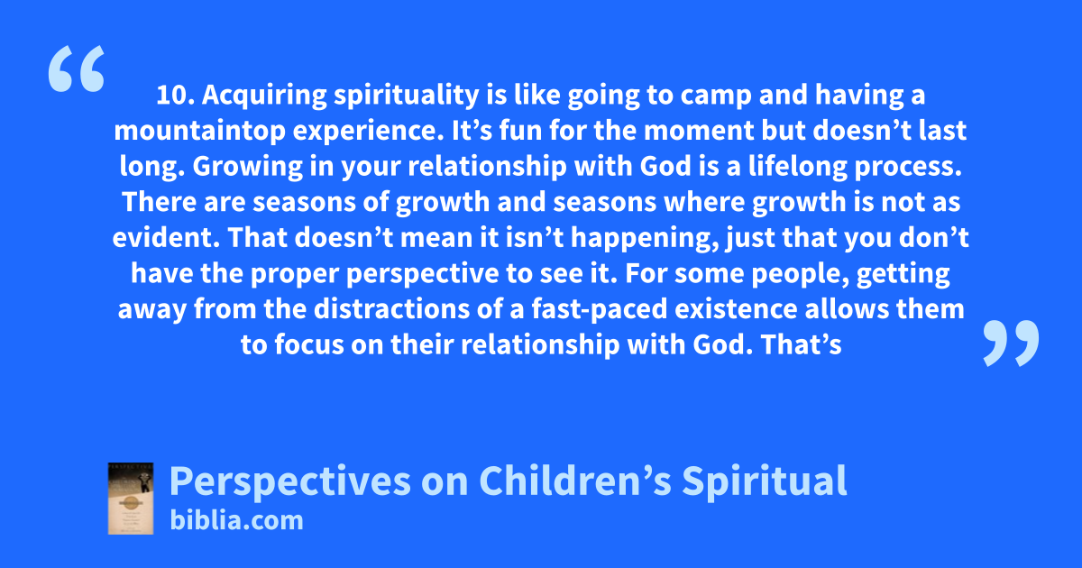 10. Acquiring spirituality is like going to camp and having a mountaintop experience. It’s fun for the moment but doesn’t last long. Growing in your relationship with God is a lifelong process. There are seasons of growth and seasons where growth is not as evident. That doesn’t mean it isn’t happening, just that you don’t have the proper perspective to see it. For some people, getting away from the distractions of a fast-paced existence allows them to focus on their relationship with God. That’s