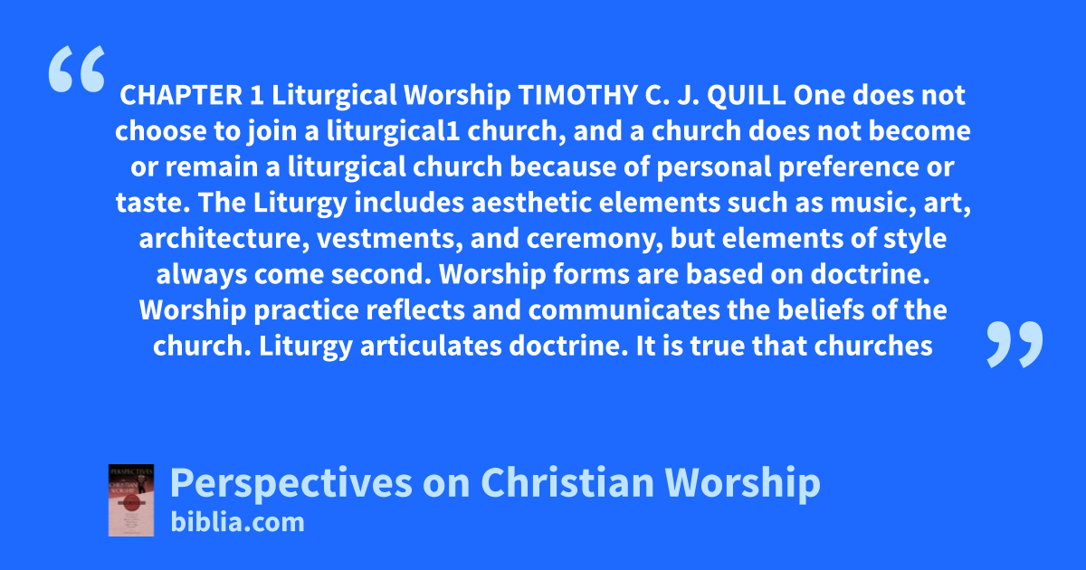 CHAPTER 1 Liturgical Worship TIMOTHY C. J. QUILL One does not choose to join a liturgical1 church, and a church does not become or remain a liturgical church because of personal preference or taste. The Liturgy includes aesthetic elements such as music, art, architecture, vestments, and ceremony, but elements of style always come second. Worship forms are based on doctrine. Worship practice reflects and communicates the beliefs of the church. Liturgy articulates doctrine. It is true that churches