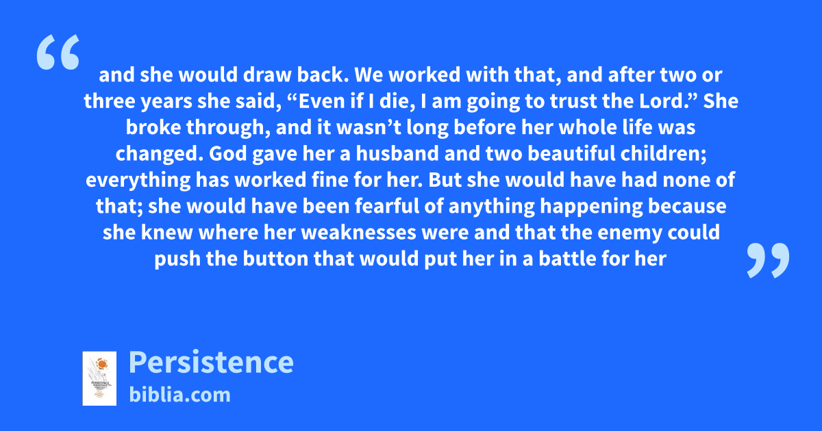 and she would draw back. We worked with that, and after two or three years she said, “Even if I die, I am going to trust the Lord.” She broke through, and it wasn’t long before her whole life was changed. God gave her a husband and two beautiful children; everything has worked fine for her. But she would have had none of that; she would have been fearful of anything happening because she knew where her weaknesses were and that the enemy could push the button that would put her in a battle for her