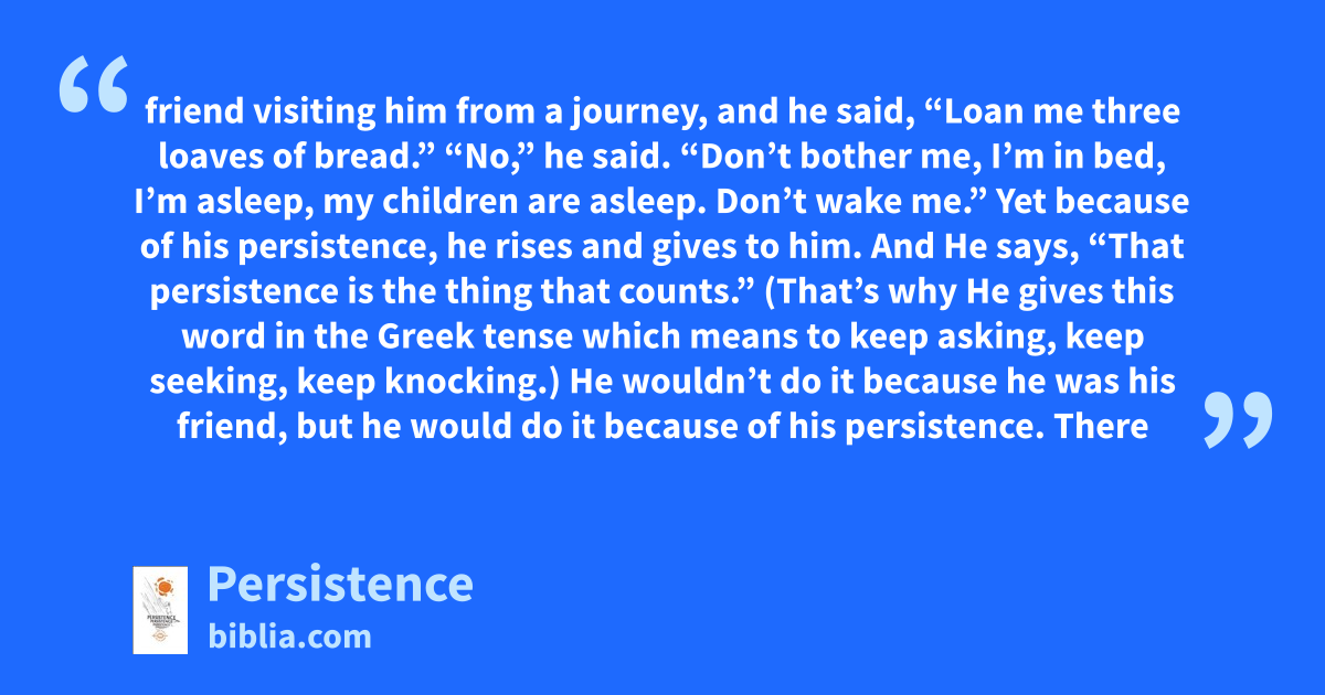 friend visiting him from a journey, and he said, “Loan me three loaves of bread.” “No,” he said. “Don’t bother me, I’m in bed, I’m asleep, my children are asleep. Don’t wake me.” Yet because of his persistence, he rises and gives to him. And He says, “That persistence is the thing that counts.” (That’s why He gives this word in the Greek tense which means to keep asking, keep seeking, keep knocking.) He wouldn’t do it because he was his friend, but he would do it because of his persistence. There