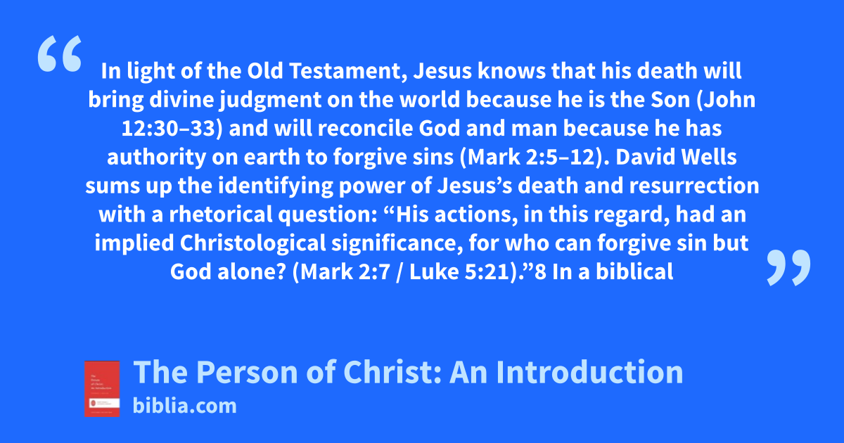In light of the Old Testament, Jesus knows that his death will bring divine judgment on the world because he is the Son (John 12:30–33) and will reconcile God and man because he has authority on earth to forgive sins (Mark 2:5–12). David Wells sums up the identifying power of Jesus’s death and resurrection with a rhetorical question: “His actions, in this regard, had an implied Christological significance, for who can forgive sin but God alone? (Mark 2:7 / Luke 5:21).”8 In a biblical
