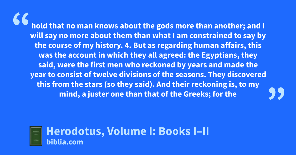 hold that no man knows about the gods more than another; and I will say no more about them than what I am constrained to say by the course of my history. 4. But as regarding human affairs, this was the account in which they all agreed: the Egyptians, they said, were the first men who reckoned by years and made the year to consist of twelve divisions of the seasons. They discovered this from the stars (so they said). And their reckoning is, to my mind, a juster one than that of the Greeks; for the