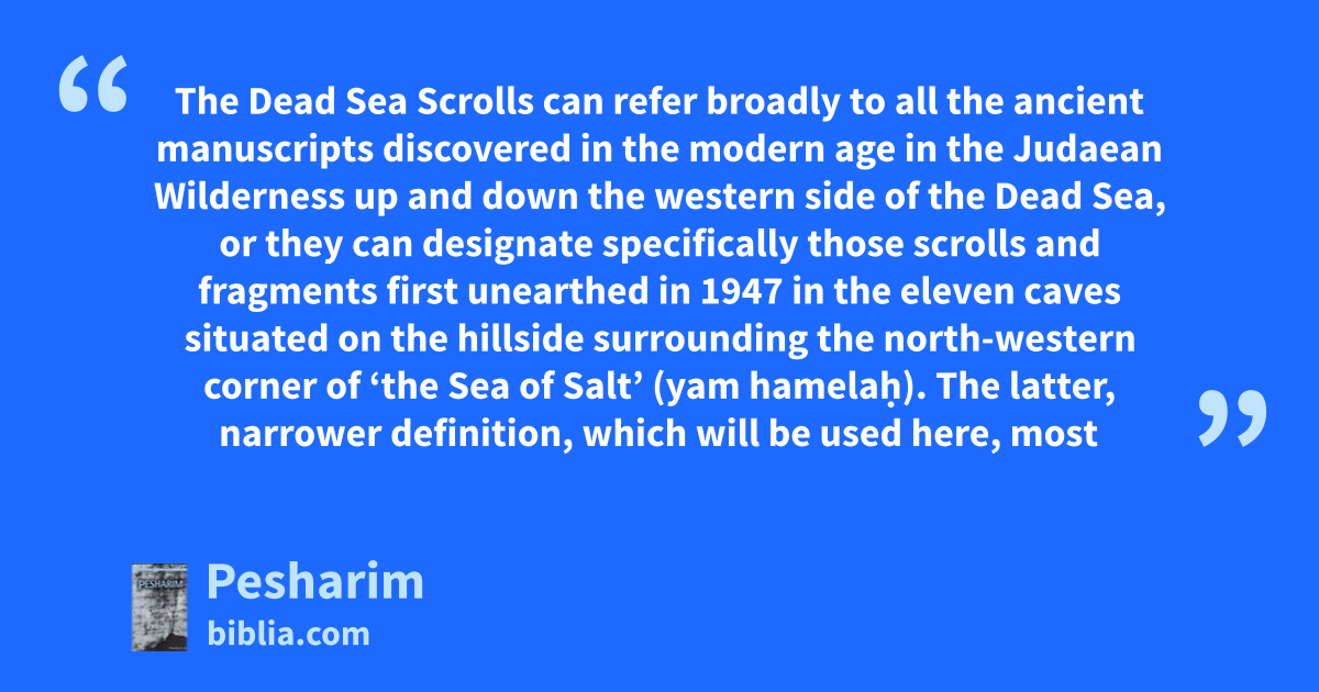The Dead Sea Scrolls can refer broadly to all the ancient manuscripts discovered in the modern age in the Judaean Wilderness up and down the western side of the Dead Sea, or they can designate specifically those scrolls and fragments first unearthed in 1947 in the eleven caves situated on the hillside surrounding the north-western corner of ‘the Sea of Salt’ (yam hamelaḥ). The latter, narrower definition, which will be used here, most