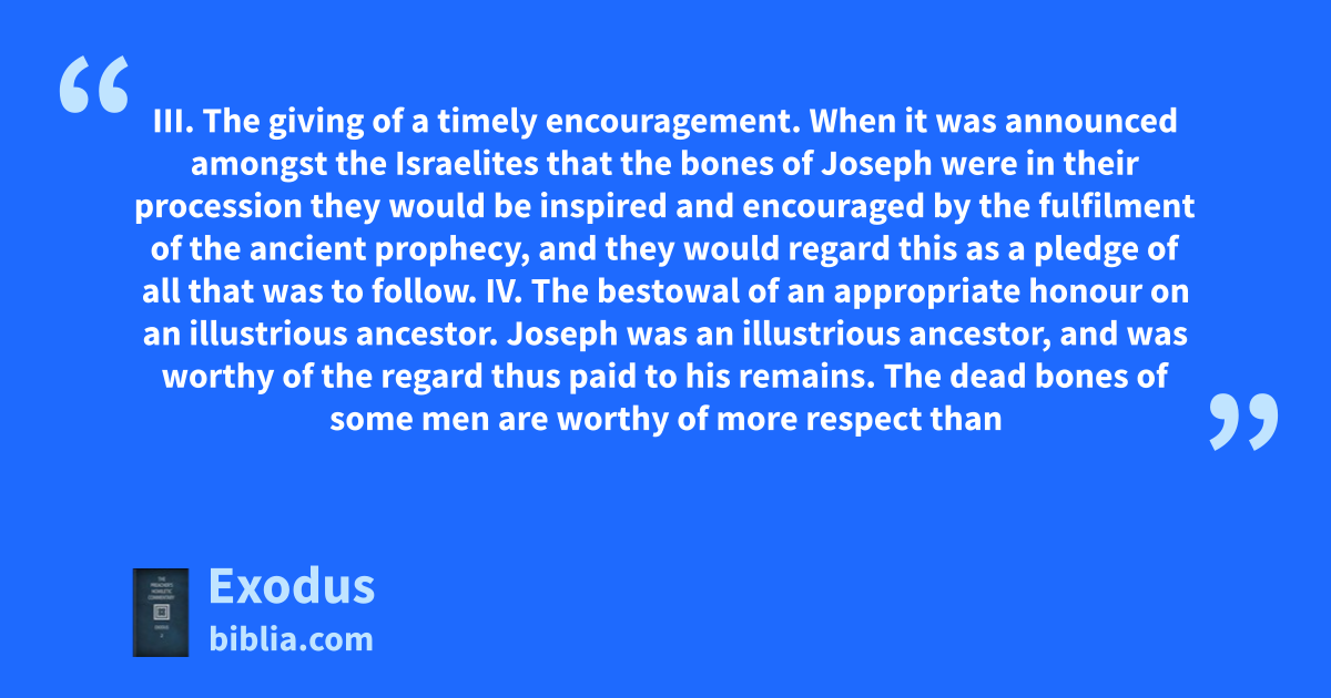 III. The giving of a timely encouragement. When it was announced amongst the Israelites that the bones of Joseph were in their procession they would be inspired and encouraged by the fulfilment of the ancient prophecy, and they would regard this as a pledge of all that was to follow. IV. The bestowal of an appropriate honour on an illustrious ancestor. Joseph was an illustrious ancestor, and was worthy of the regard thus paid to his remains. The dead bones of some men are worthy of more respect than
