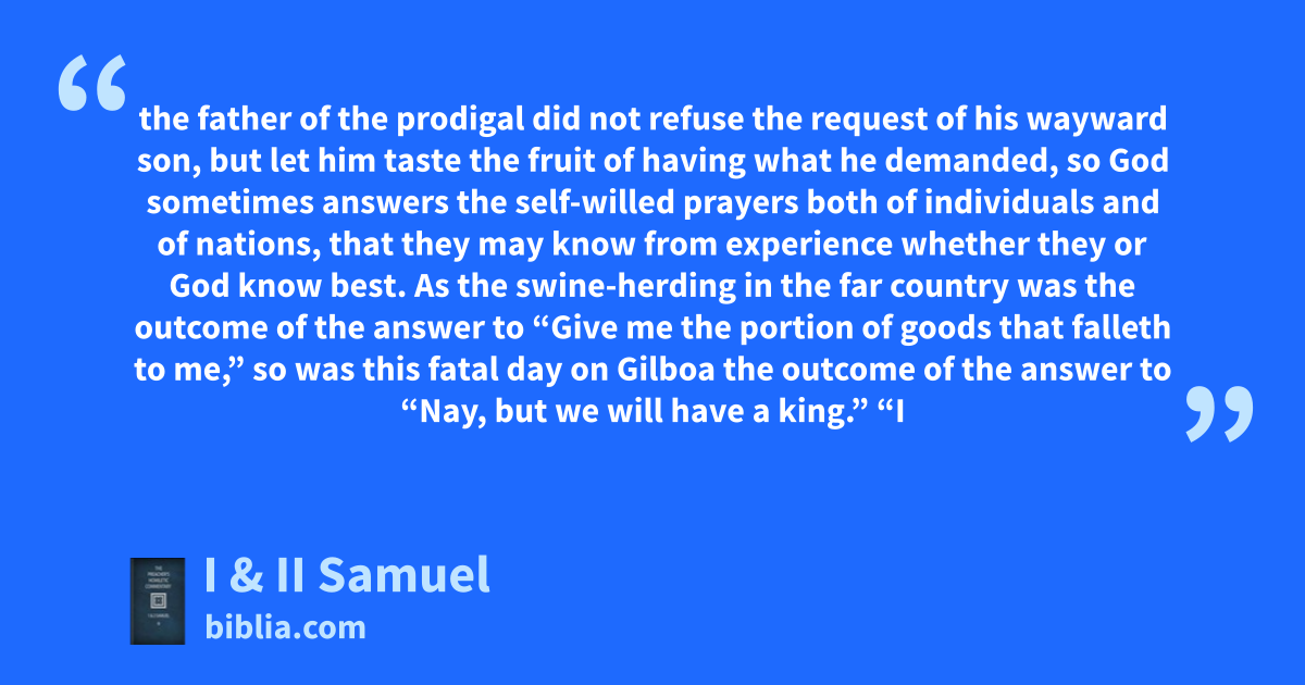 the father of the prodigal did not refuse the request of his wayward son, but let him taste the fruit of having what he demanded, so God sometimes answers the self-willed prayers both of individuals and of nations, that they may know from experience whether they or God know best. As the swine-herding in the far country was the outcome of the answer to “Give me the portion of goods that falleth to me,” so was this fatal day on Gilboa the outcome of the answer to “Nay, but we will have a king.” “I