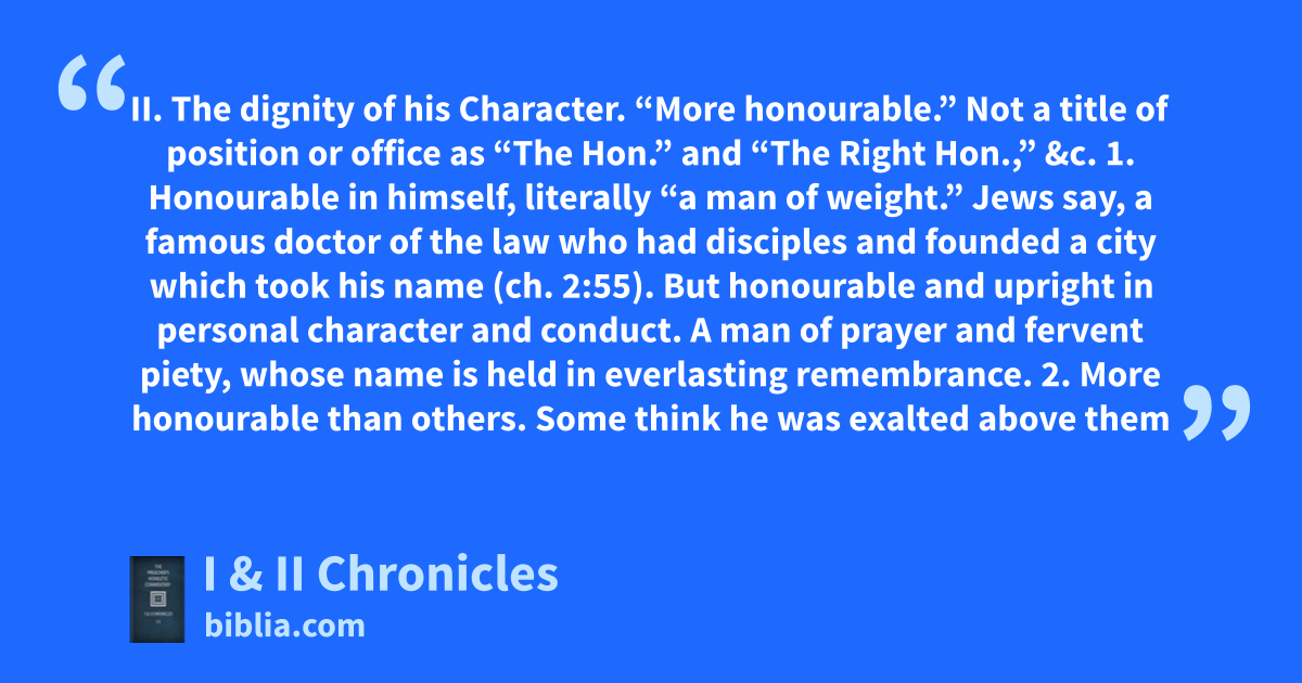 II. The dignity of his Character. “More honourable.” Not a title of position or office as “The Hon.” and “The Right Hon.,” &c. 1. Honourable in himself, literally “a man of weight.” Jews say, a famous doctor of the law who had disciples and founded a city which took his name (ch. 2:55). But honourable and upright in personal character and conduct. A man of prayer and fervent piety, whose name is held in everlasting remembrance. 2. More honourable than others. Some think he was exalted above them