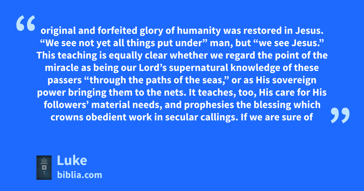 original and forfeited glory of humanity was restored in Jesus. “We see not yet all things put under” man, but “we see Jesus.” This teaching is equally clear whether we regard the point of the miracle as being our Lord’s supernatural knowledge of these passers “through the paths of the seas,” or as His sovereign power bringing them to the nets. It teaches, too, His care for His followers’ material needs, and prophesies the blessing which crowns obedient work in secular callings. If we are sure of