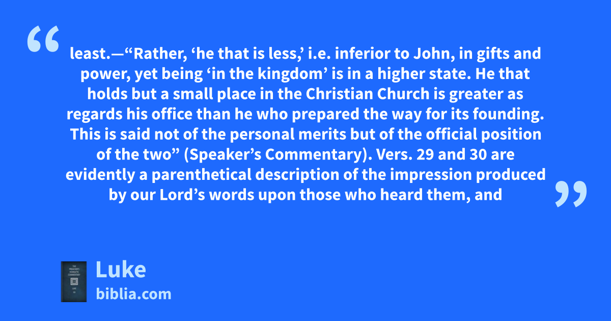 least.—“Rather, ‘he that is less,’ i.e. inferior to John, in gifts and power, yet being ‘in the kingdom’ is in a higher state. He that holds but a small place in the Christian Church is greater as regards his office than he who prepared the way for its founding. This is said not of the personal merits but of the official position of the two” (Speaker’s Commentary). Vers. 29 and 30 are evidently a parenthetical description of the impression produced by our Lord’s words upon those who heard them, and