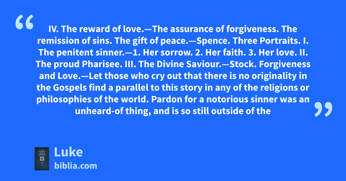 IV. The reward of love.—The assurance of forgiveness. The remission of sins. The gift of peace.—Spence. Three Portraits. I. The penitent sinner.—1. Her sorrow. 2. Her faith. 3. Her love. II. The proud Pharisee. III. The Divine Saviour.—Stock. Forgiveness and Love.—Let those who cry out that there is no originality in the Gospels find a parallel to this story in any of the religions or philosophies of the world. Pardon for a notorious sinner was an unheard-of thing, and is so still outside of the