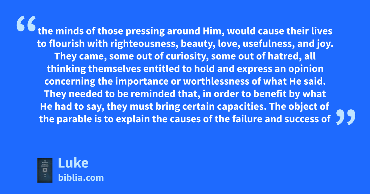 the minds of those pressing around Him, would cause their lives to flourish with righteousness, beauty, love, usefulness, and joy. They came, some out of curiosity, some out of hatred, all thinking themselves entitled to hold and express an opinion concerning the importance or worthlessness of what He said. They needed to be reminded that, in order to benefit by what He had to say, they must bring certain capacities. The object of the parable is to explain the causes of the failure and success of