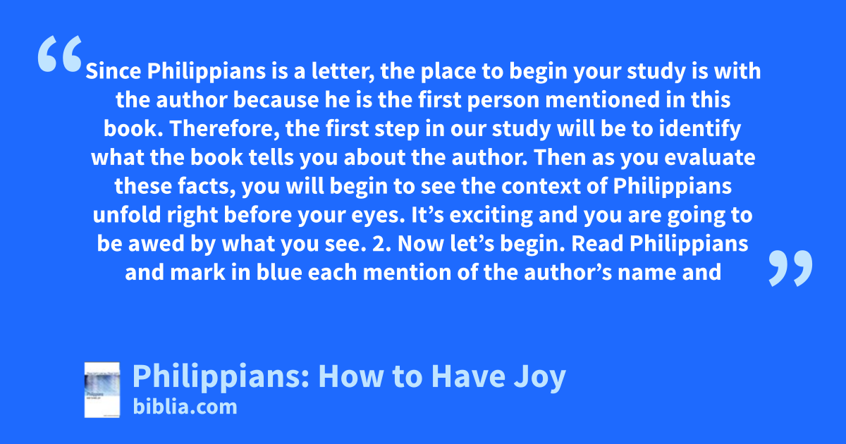 Since Philippians is a letter, the place to begin your study is with the author because he is the first person mentioned in this book. Therefore, the first step in our study will be to identify what the book tells you about the author. Then as you evaluate these facts, you will begin to see the context of Philippians unfold right before your eyes. It’s exciting and you are going to be awed by what you see. 2. Now let’s begin. Read Philippians and mark in blue each mention of the author’s name and
