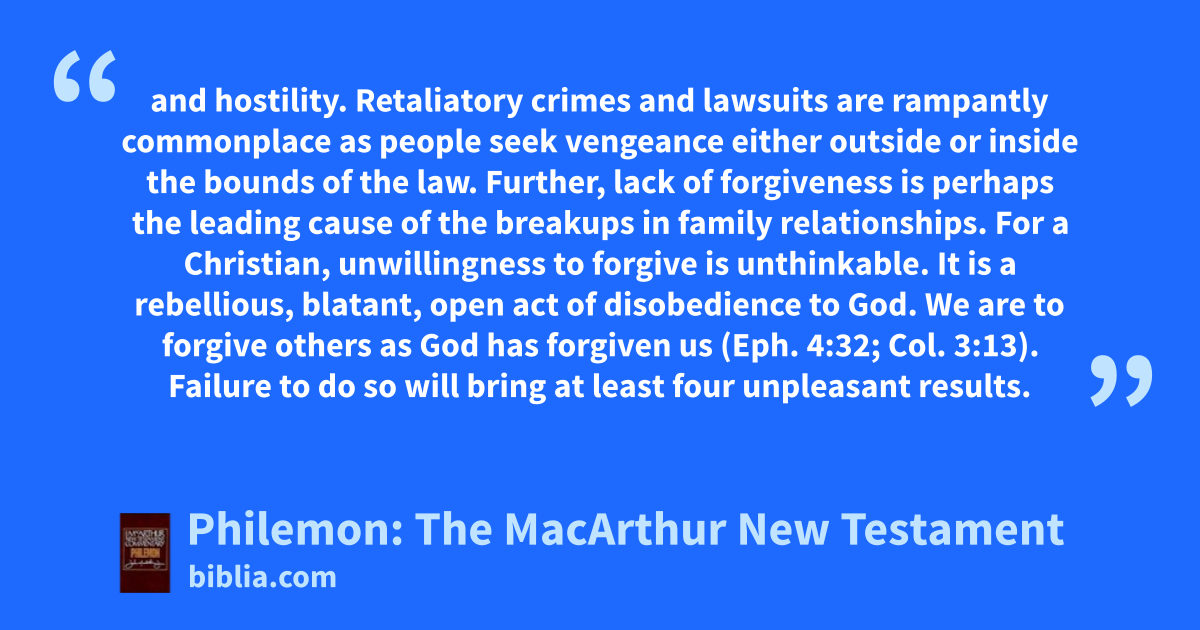 and hostility. Retaliatory crimes and lawsuits are rampantly commonplace as people seek vengeance either outside or inside the bounds of the law. Further, lack of forgiveness is perhaps the leading cause of the breakups in family relationships. For a Christian, unwillingness to forgive is unthinkable. It is a rebellious, blatant, open act of disobedience to God. We are to forgive others as God has forgiven us (Eph. 4:32; Col. 3:13). Failure to do so will bring at least four unpleasant results.