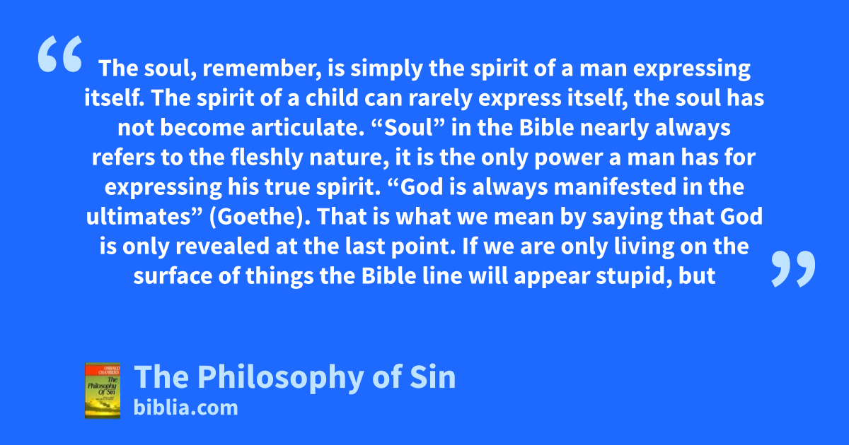 The soul, remember, is simply the spirit of a man expressing itself. The spirit of a child can rarely express itself, the soul has not become articulate. “Soul” in the Bible nearly always refers to the fleshly nature, it is the only power a man has for expressing his true spirit. “God is always manifested in the ultimates” (Goethe). That is what we mean by saying that God is only revealed at the last point. If we are only living on the surface of things the Bible line will appear stupid, but