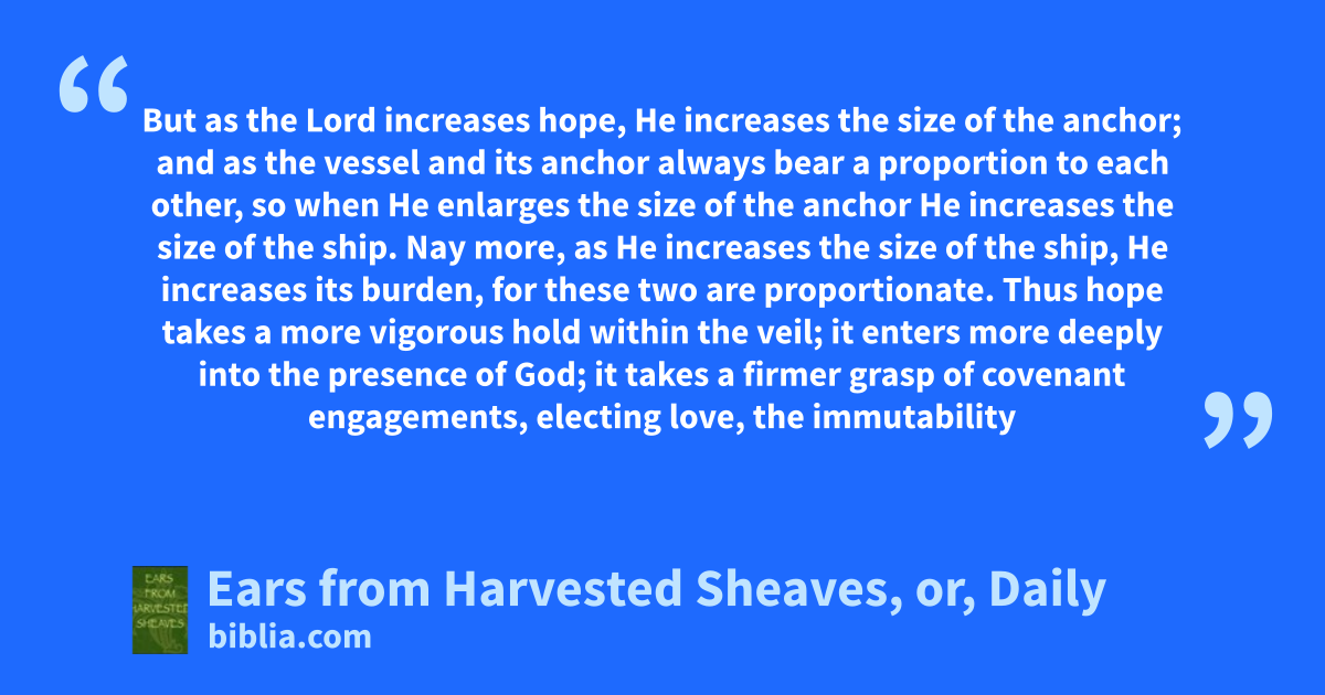 But as the Lord increases hope, He increases the size of the anchor; and as the vessel and its anchor always bear a proportion to each other, so when He enlarges the size of the anchor He increases the size of the ship. Nay more, as He increases the size of the ship, He increases its burden, for these two are proportionate. Thus hope takes a more vigorous hold within the veil; it enters more deeply into the presence of God; it takes a firmer grasp of covenant engagements, electing love, the immutability