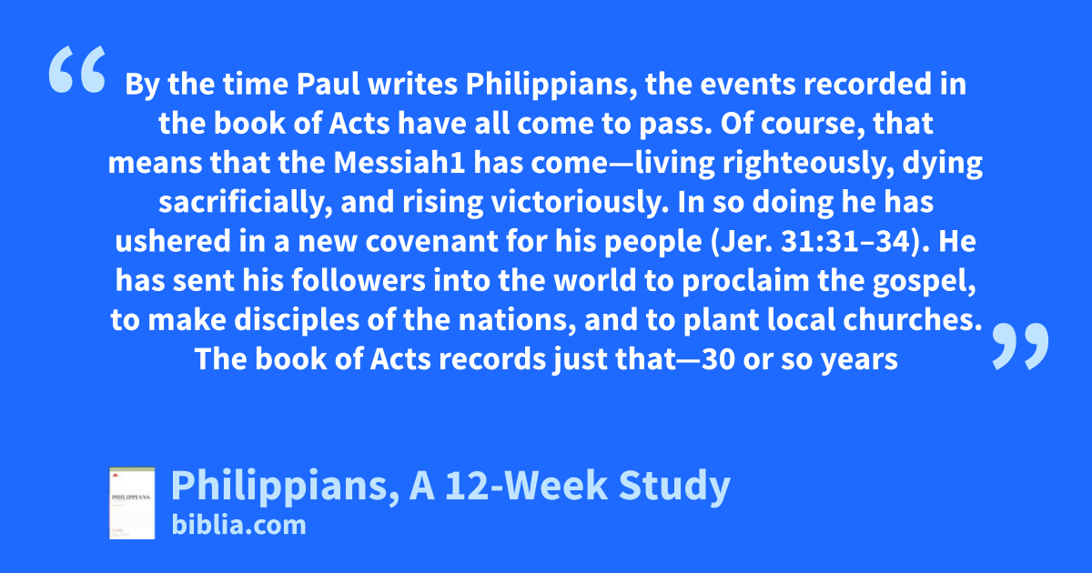 By the time Paul writes Philippians, the events recorded in the book of Acts have all come to pass. Of course, that means that the Messiah1 has come—living righteously, dying sacrificially, and rising victoriously. In so doing he has ushered in a new covenant for his people (Jer. 31:31–34). He has sent his followers into the world to proclaim the gospel, to make disciples of the nations, and to plant local churches. The book of Acts records just that—30 or so years