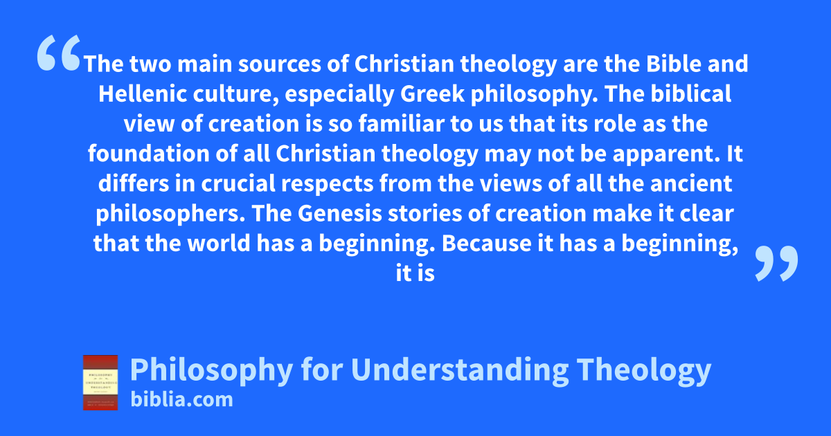 The two main sources of Christian theology are the Bible and Hellenic culture, especially Greek philosophy. The biblical view of creation is so familiar to us that its role as the foundation of all Christian theology may not be apparent. It differs in crucial respects from the views of all the ancient philosophers. The Genesis stories of creation make it clear that the world has a beginning. Because it has a beginning, it is