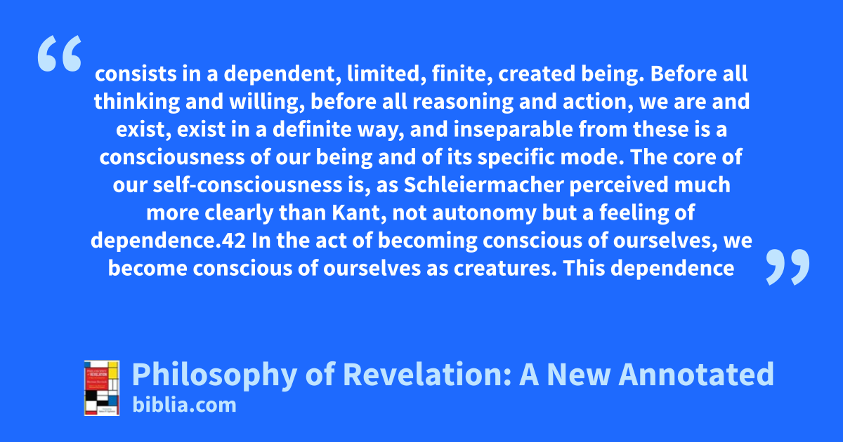 consists in a dependent, limited, finite, created being. Before all thinking and willing, before all reasoning and action, we are and exist, exist in a definite way, and inseparable from these is a consciousness of our being and of its specific mode. The core of our self-consciousness is, as Schleiermacher perceived much more clearly than Kant, not autonomy but a feeling of dependence.42 In the act of becoming conscious of ourselves, we become conscious of ourselves as creatures. This dependence