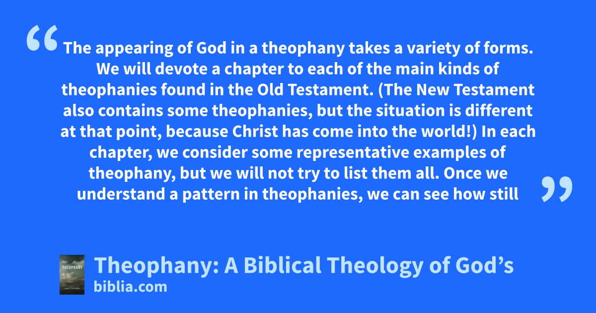 The appearing of God in a theophany takes a variety of forms. We will devote a chapter to each of the main kinds of theophanies found in the Old Testament. (The New Testament also contains some theophanies, but the situation is different at that point, because Christ has come into the world!) In each chapter, we consider some representative examples of theophany, but we will not try to list them all. Once we understand a pattern in theophanies, we can see how still